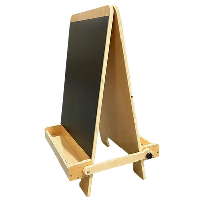 Cavalete desenvolvido para fins pedagógicos e para práticas de pintura livre e desenho, podendo ser utilizado com folhas de papel fixadas à estrutura ou com giz na lousa preta, oferecendo superfície adequada para escrita, desenho e registro de ideias em atividades individuais ou coletivas. A trava lateral assegura estabilidade durante o uso, favorecendo produções gráficas realizadas com autonomia. Os suportes inferiores, dispostos em ambos os lados, permitem a organização e o acesso facilitado aos materiais, mantendo-os ao alcance das crianças. Trata-se de um recurso funcional e versátil, que contribui para o desenvolvimento da linguagem escrita, da criatividade e da expressão artística, desenvolvendo a experimentação de cores e formas, a percepção sensorial e a imaginação.