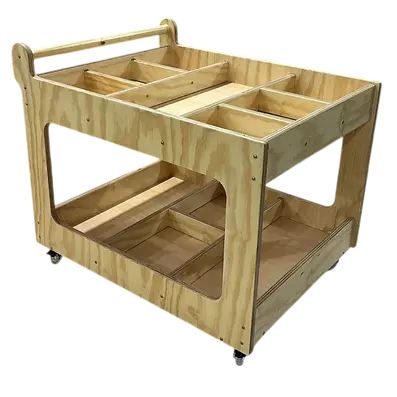 Confeccionado em compensado de Pinus Clear, o Carrinho Ateliê é um móvel destinado ao armazenamento e à organização de diversos materiais pedagógicos. Na parte superior, possui seis divisórias pequenas (24 x 20 cm) e uma divisória grande (24 x 61 cm). Na parte inferior, conta com duas divisórias grandes (24 x 61 cm) e duas médias (24 x 30 cm). Possui pegador frontal para fácil locomoção e quatro rodas giratórias equipadas com sistema de freio, garantindo mobilidade e segurança durante o uso. O produto possui cantos arredondados, sem partes cortantes, ásperas ou farpas, e acabamento em verniz atóxico.